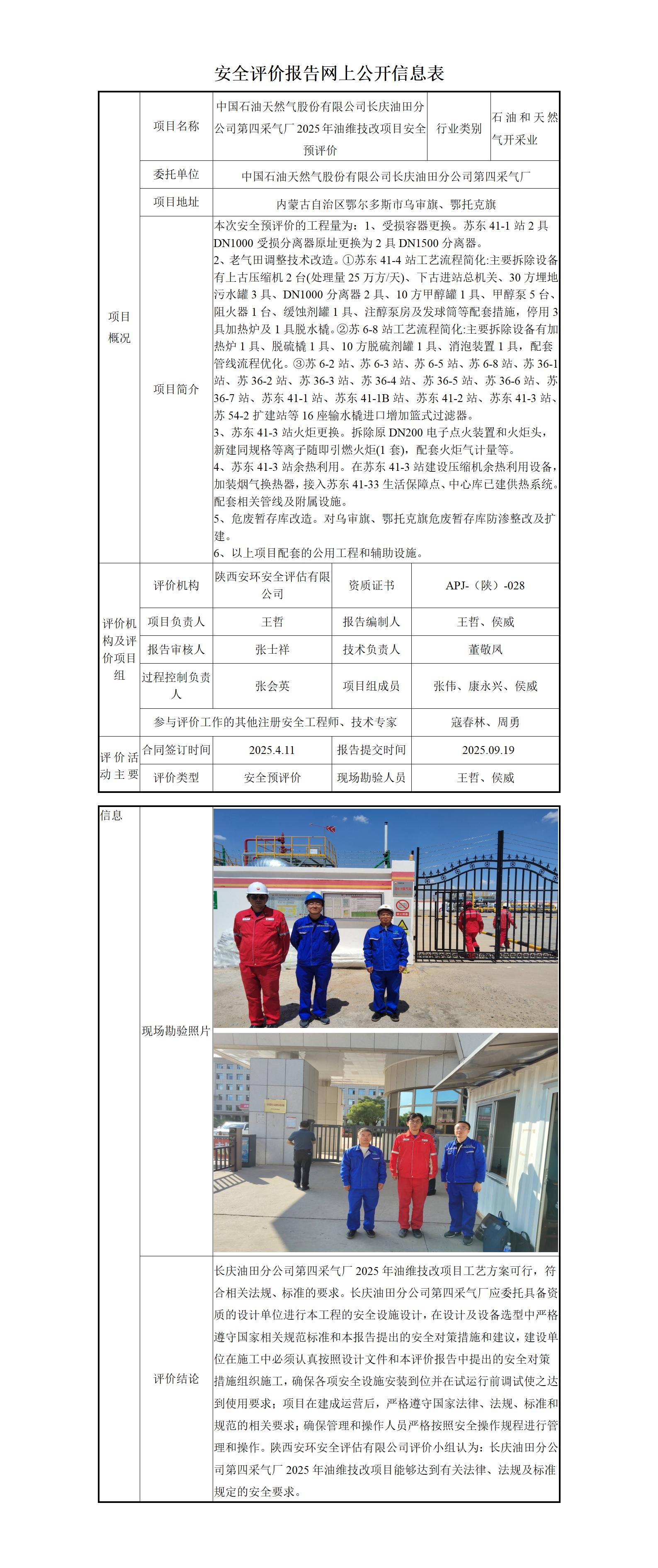 中国石油天然气股份有限公司长庆油田分公司第四采气厂2025年油维技改项目安全预评价