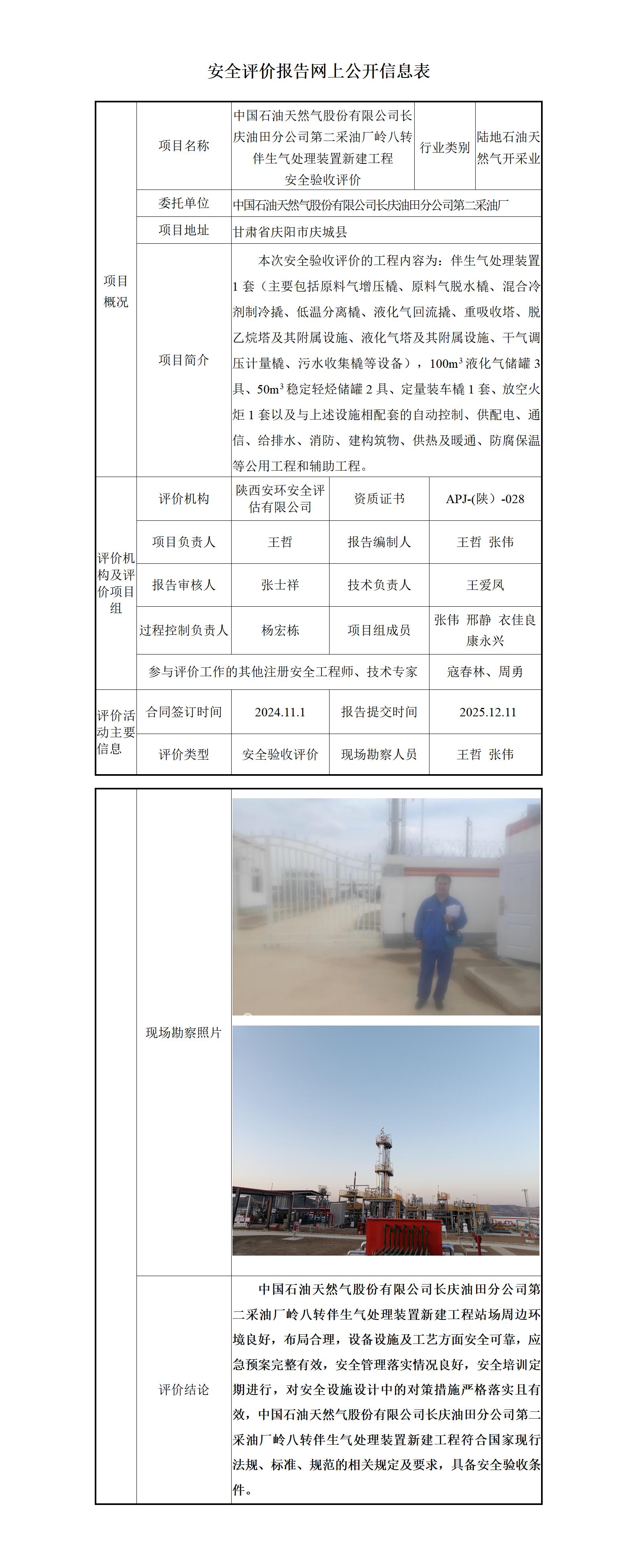 中国石油天然气股份有限公司长庆油田分公司第二采油厂岭八转伴生气处理装置新建工程安全验收评价
