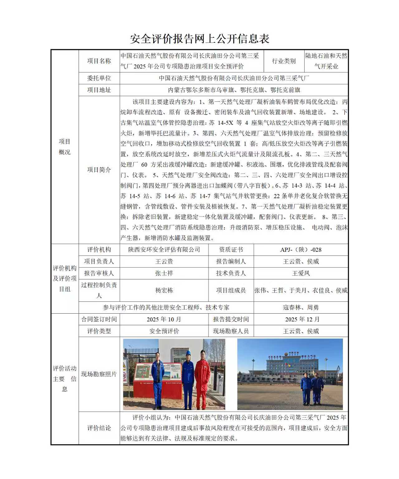 中国石油天然气股份有限公司长庆油田分公司第三采气厂2025年公司专项隐患治理项目安全预评价