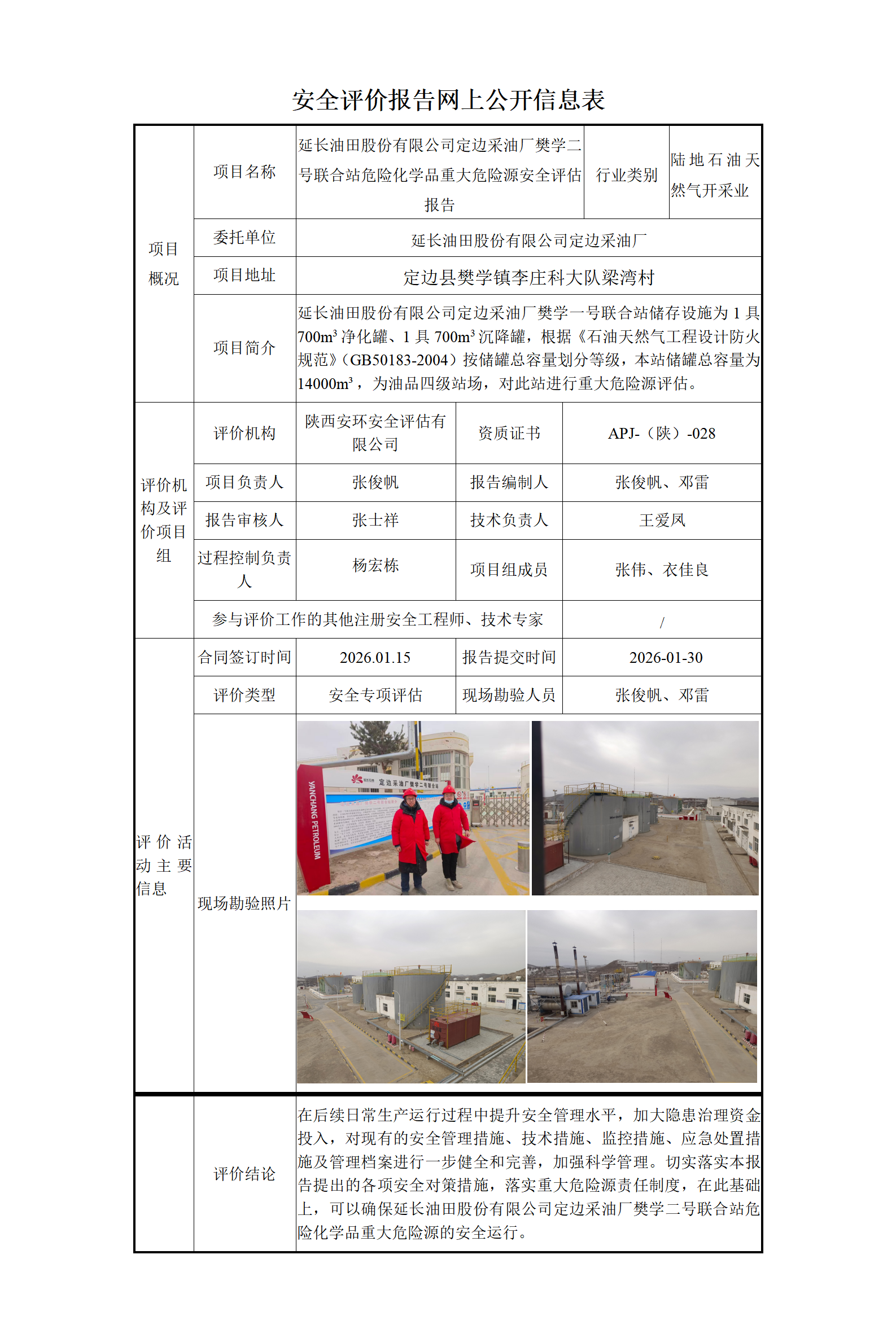 延长油田股份有限公司定边采油厂樊学二号联合站危险化学品重大危险源安全评估
